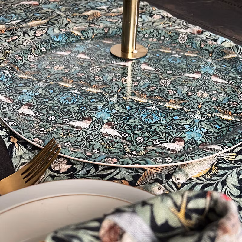 Bring naturens fred og skjønnhet til bordet ditt med dette vakre fatet. William Morris' fuglemotiv i grønne, blå og brune nyanser fremhever fugler, blader og blomster, slik at borddekningen føles levende og harmonisk. Den naturlige teksturen i lin kombinerer funksjonalitet med et klassisk og jordnært uttrykk – perfekt for både hverdag og fest.