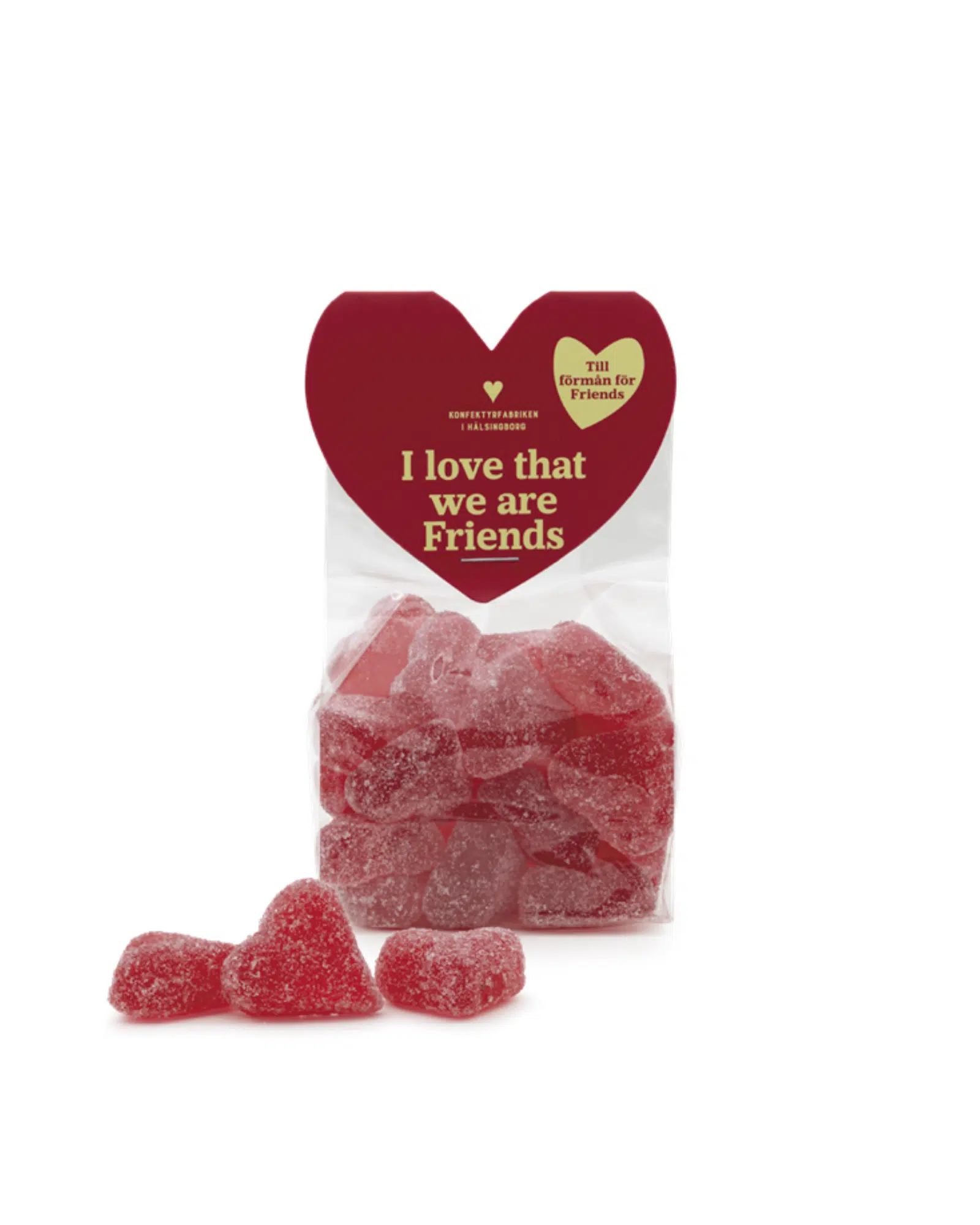 De søte gelehjertene og nougathjertene presenteres her i små poser. Du finner dem også i større forpakninger i denne kategorien.