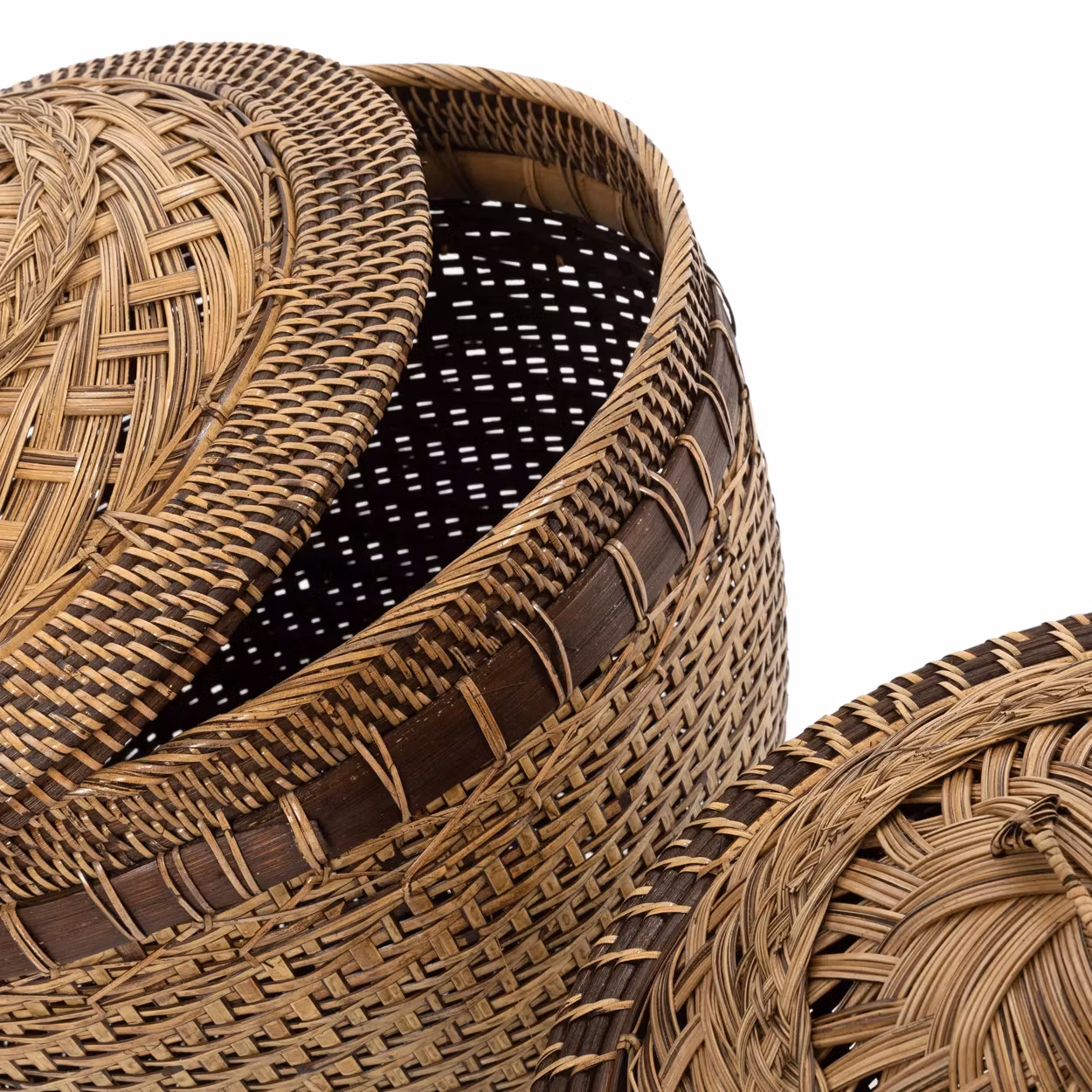 Disse kurvene er håndlaget av rotting med omhu og gir et snev av klassisk eleganse. De er tilgjengelige i to størrelser som passer dine oppbevaringsbehov, og bringer både stil og funksjon inn i hjemmeinnredningen din. De dypbrune aksentene og detaljerte mønstrene gjør dette til et fantastisk designstykke du faktisk kan bruke!