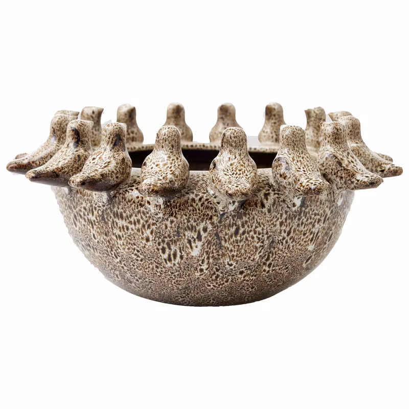 En nydelig keramikk-skål med små fugler som sitter på kanten. Nydelig beige/brun/taupe farge. Størrelsen er 28x28x14 cm