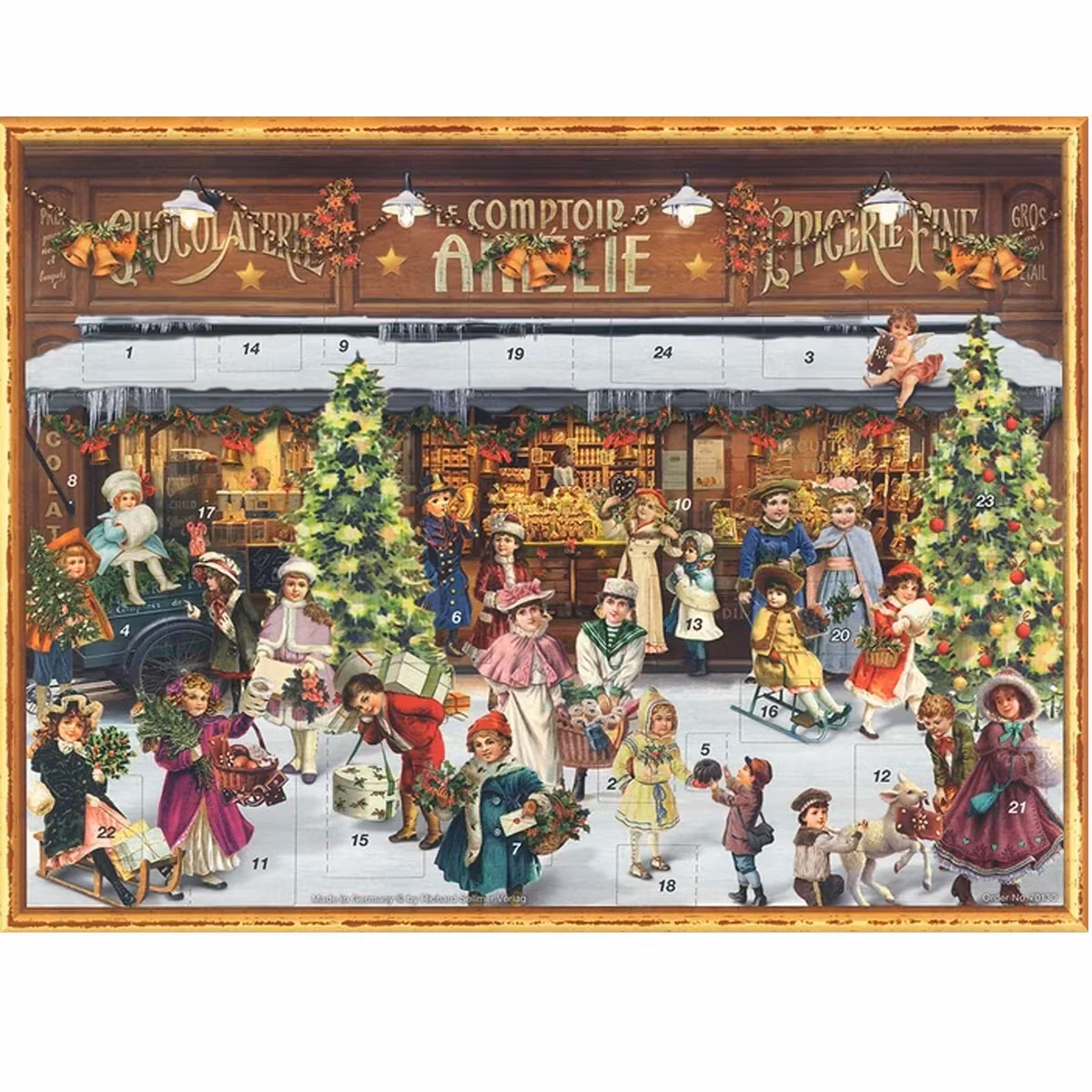 Du vet ikke hvor du skal se først: De vakkert dekorerte juletrærne, utstillingene i sjokoladebutikken, gavene, julepynten over butikkene. Rett og slett flott til jul. Denne adventskalenderen i stort format viser en gammel kolonibutikk, akkurat slik du forestiller deg den.