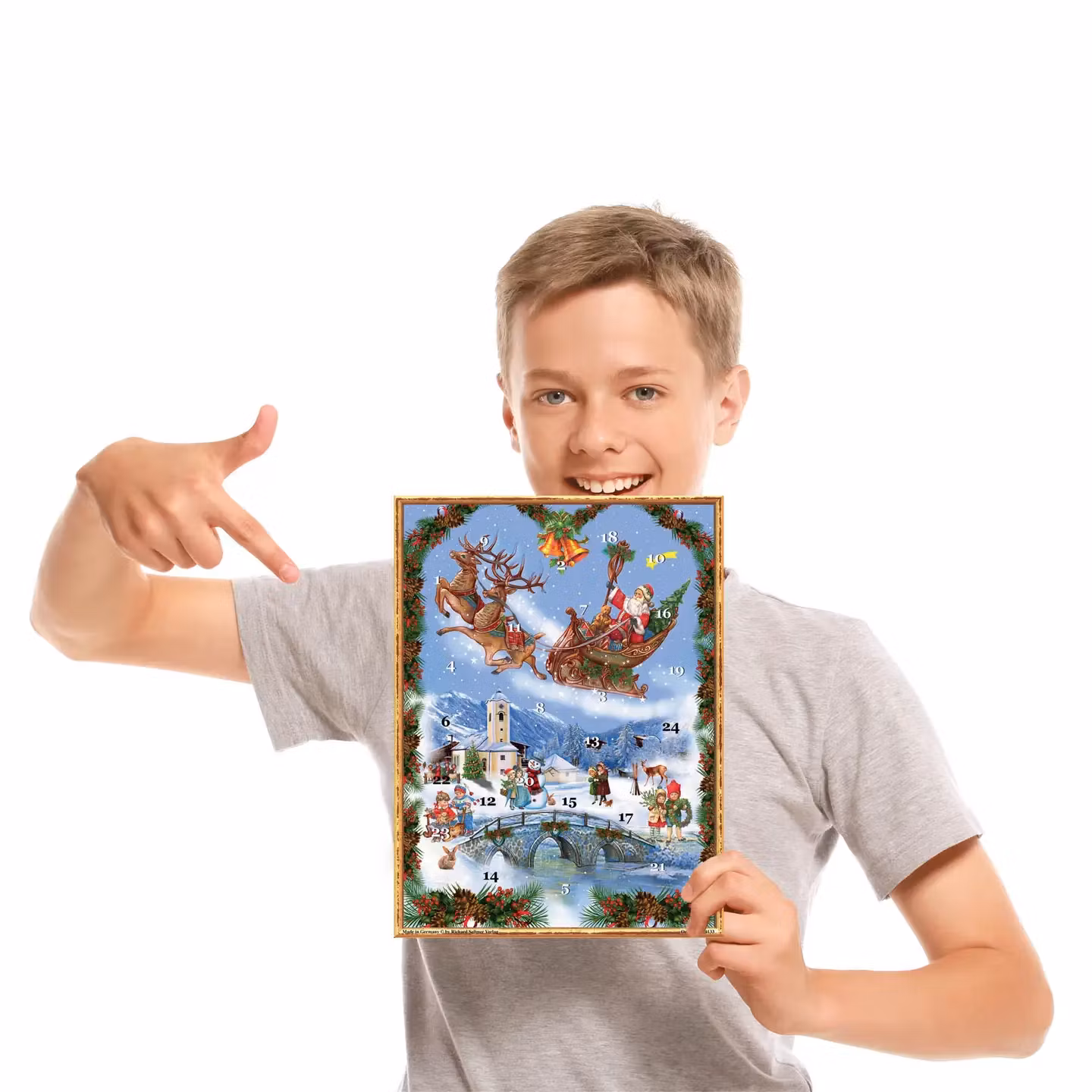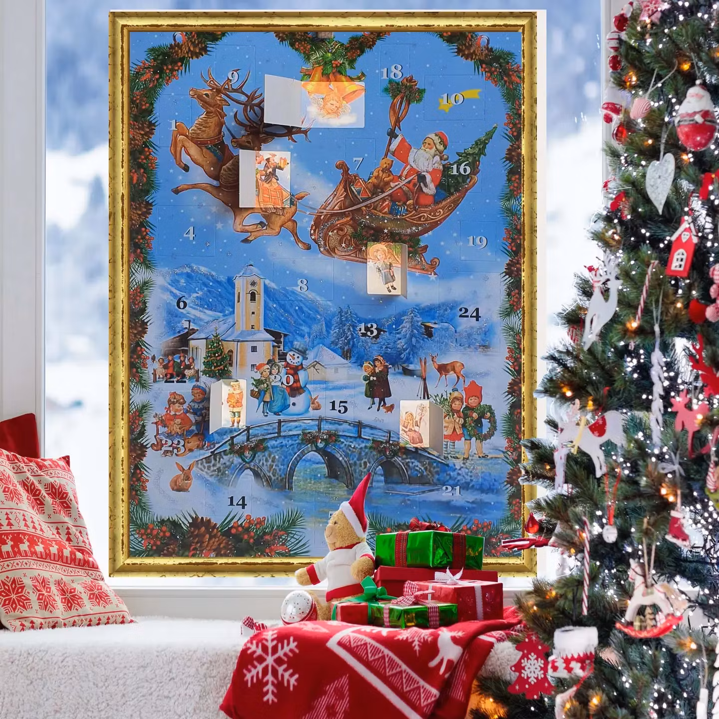 Storformat adventskalender «Julenissen i slede». En attraktiv adventskalender i vakker stil kombinert med viktorianske elementer. Bakbildene lyser opp når du henger kalenderen foran en lyskilde og glimmer skal selvfølgelig ikke mangle! Den harmonisk utformede adventskalenderen viser en snødekt fjellandsby, hvor beboerne venter spent på julenissens ankomst. Nissen flyr tradisjonelt dit med reinsleden sin, med Rudolf i front. Denne adventskalenderen tar store og små inn i et vakkert, idyllisk fjellandskap og reduserer ventetiden frem til jul. Størrelse på julekalenderen ca. 26,5 x 35,5 cm.