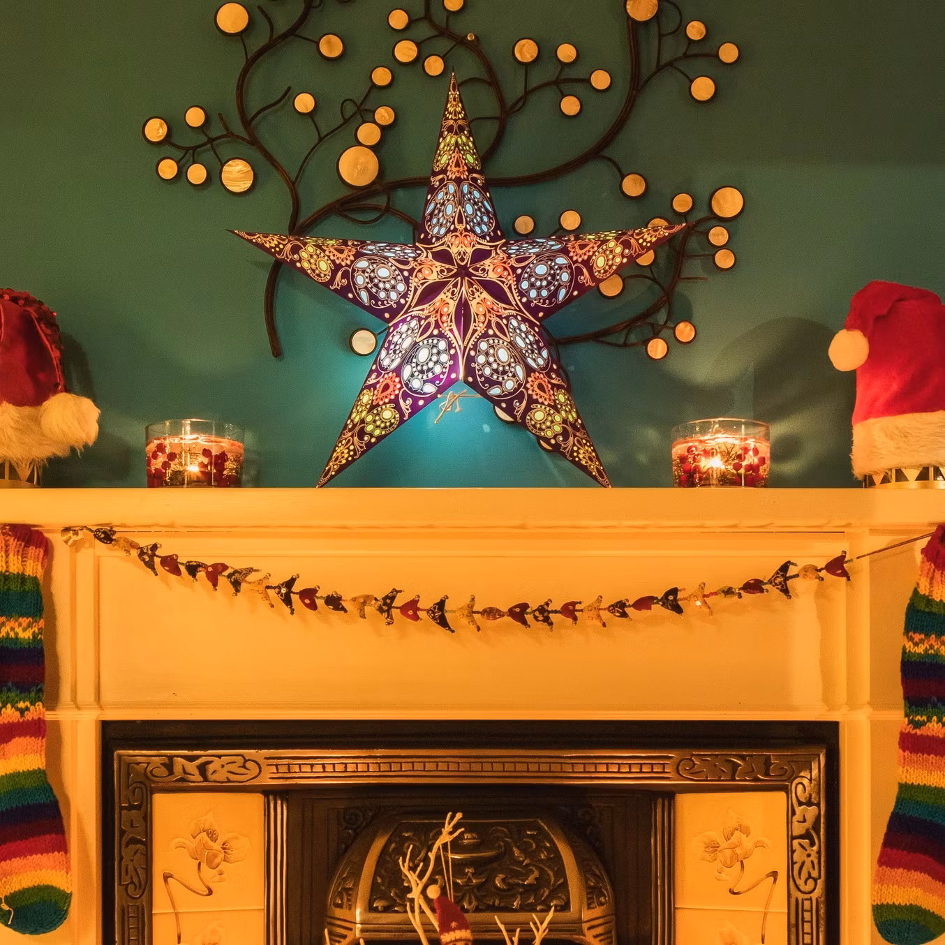 For en eksotisk atmosfære hvor som helst, prøv vår dekorative boho-chic hengende lykt i regnbuefarger. Mot en dyp lilla bakgrunn skaper blå, grønne, rosa og gule silkepapirinnsatser en spektakulær glød i farget glass. Ørsmå perforeringer gir et slående glimt, mens delikate hvite silketrykkede detaljer gir et siste touch.