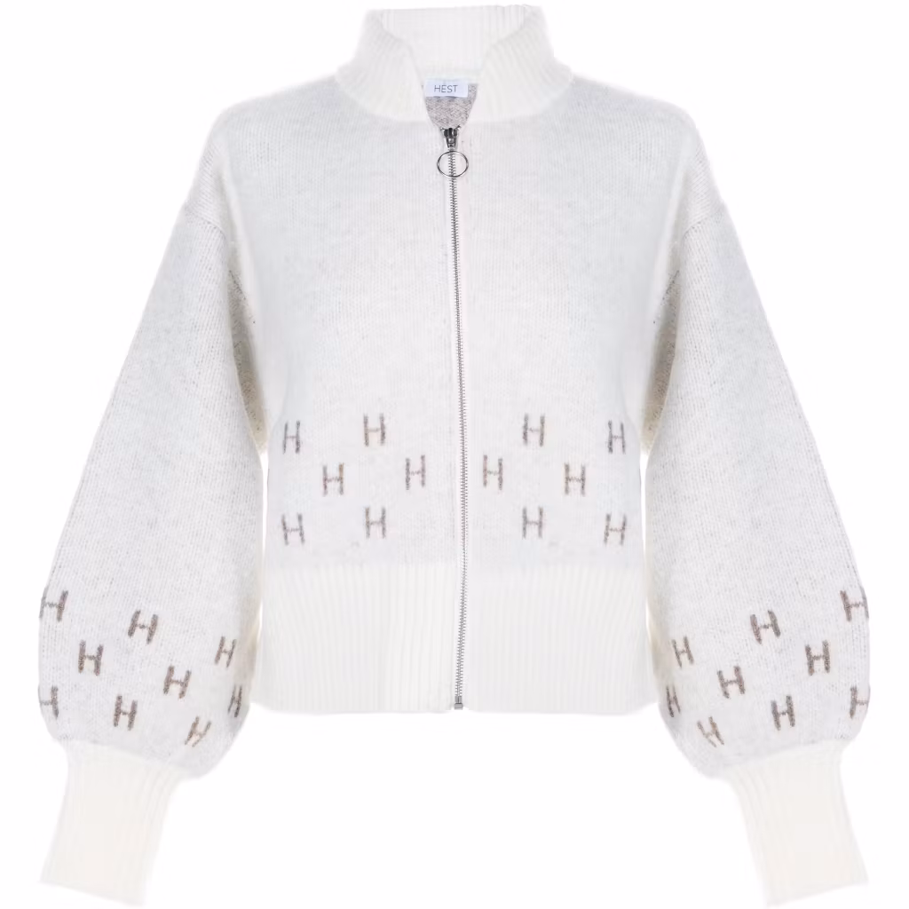 Utforsk Hést sin korte strikkejakke med glidelås, høye ribber på ermene og nederst, og elegante "H"-logoer strikket inn i designet. Laget av en behagelig blanding av 30% ull, 15% alpakka, 30% akryl, 22% nylon og 3% elastan. Denne jakken gir både stil og komfort.