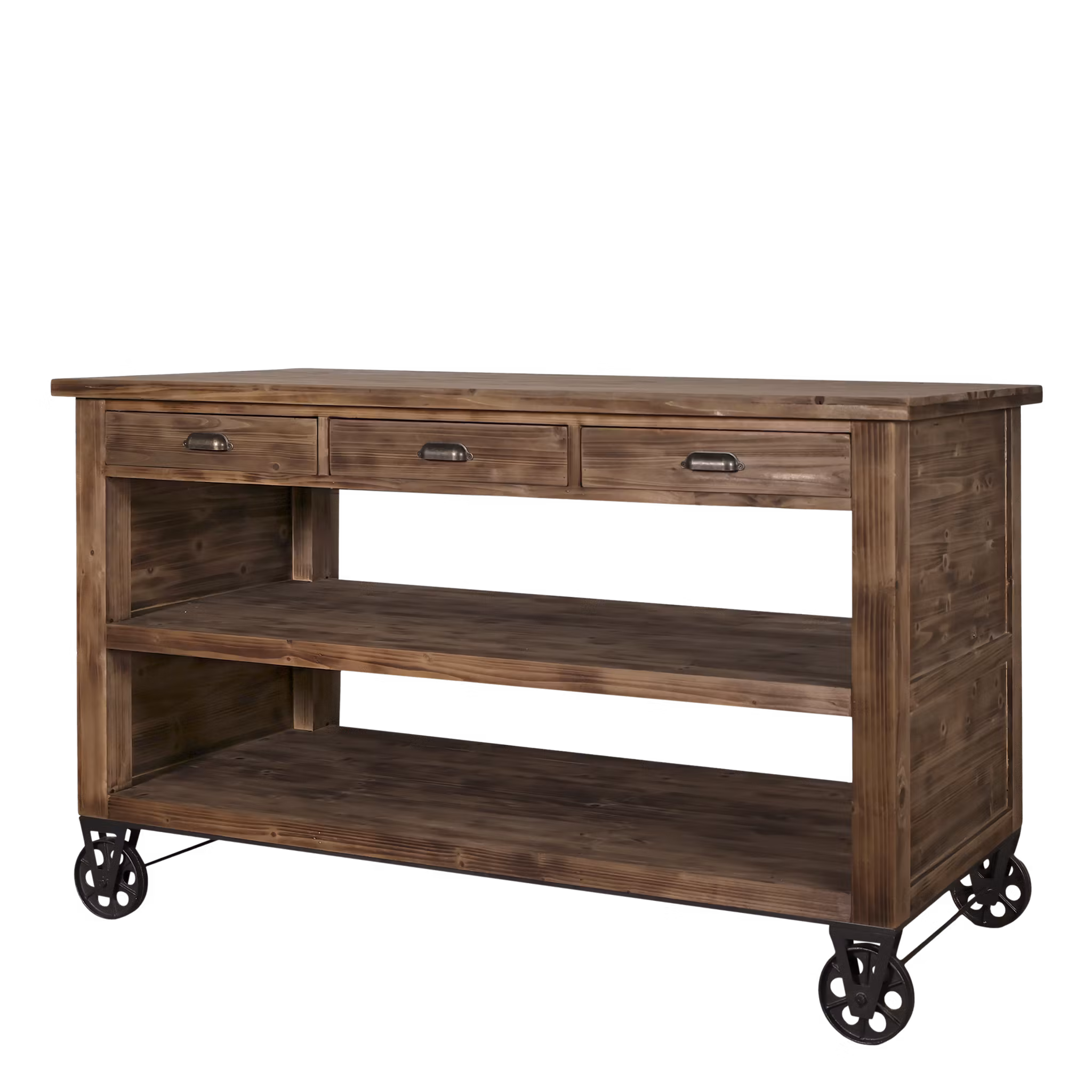 Vakker kjøkkentøy med 4 hjul så den enkelt kan flyttes rundt. Hjulene er av metall og er robuste. Kjøkkenøya består av grantre, metallbeslag og finer(inni skuffene). Den har et rustikt preg og harmonerer godt på kjøkken eller en innglasset veranda. Begge sider er like, med skuffer på lang-endene.
