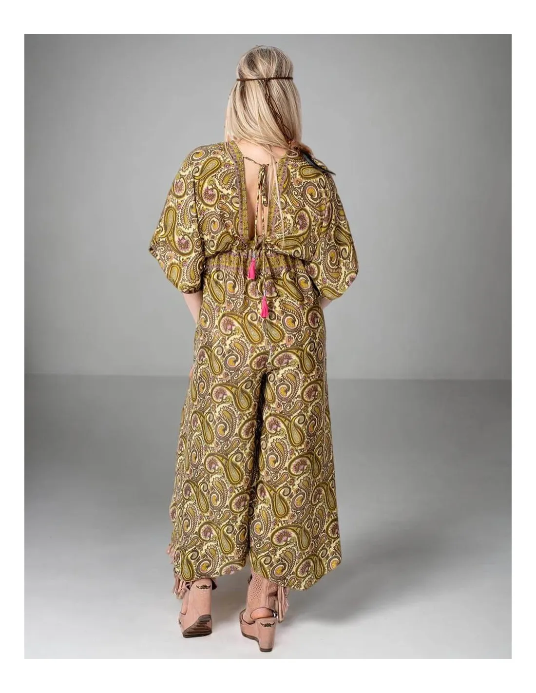 Vid, lang jumpsuit med korte ermer. Nederst er den ujevn med snitt på sidene.