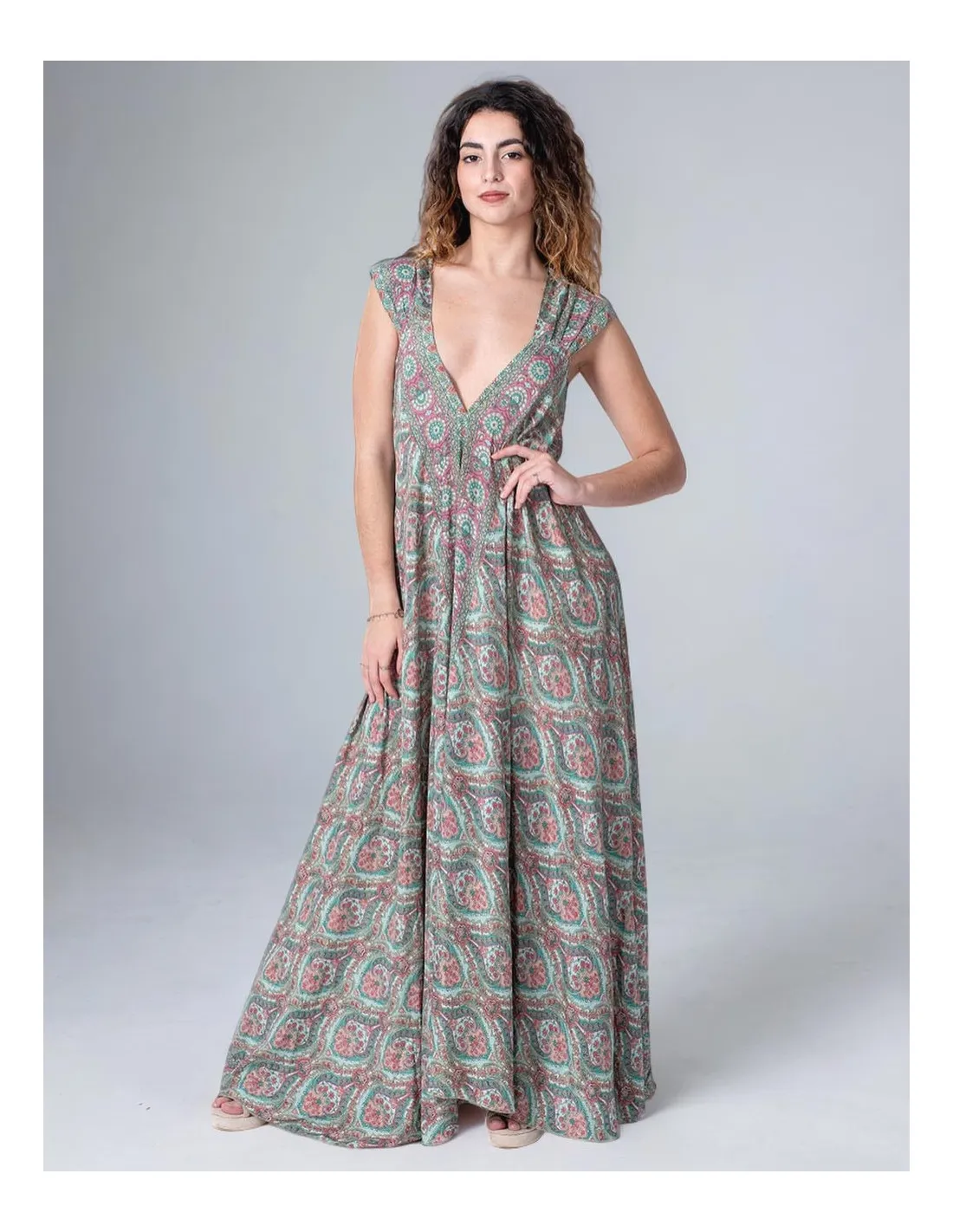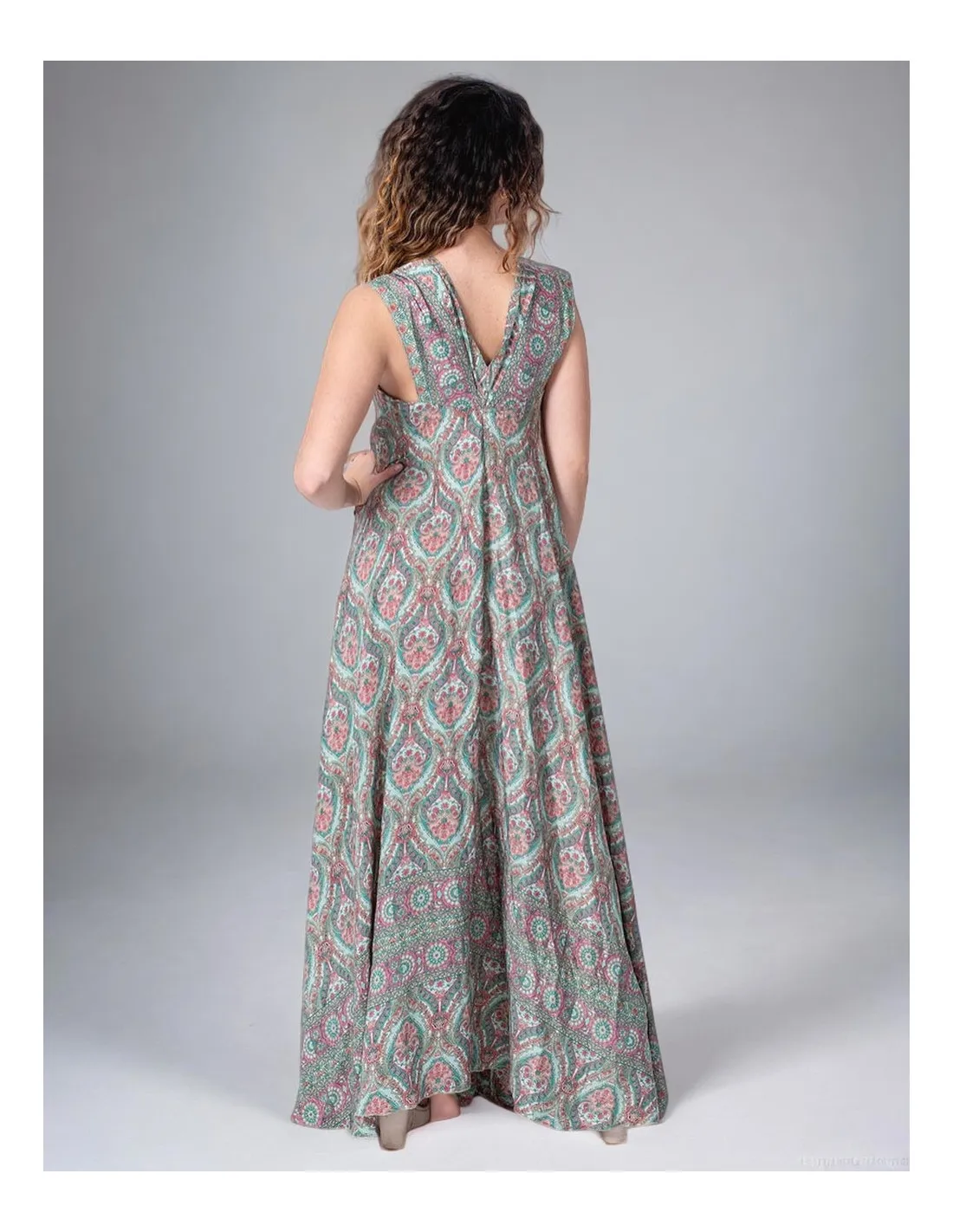 Lang, løs kjole med utmerket fall fordi den er laget av silke blandet med polyester, noe som gir den mykhet og vekt.