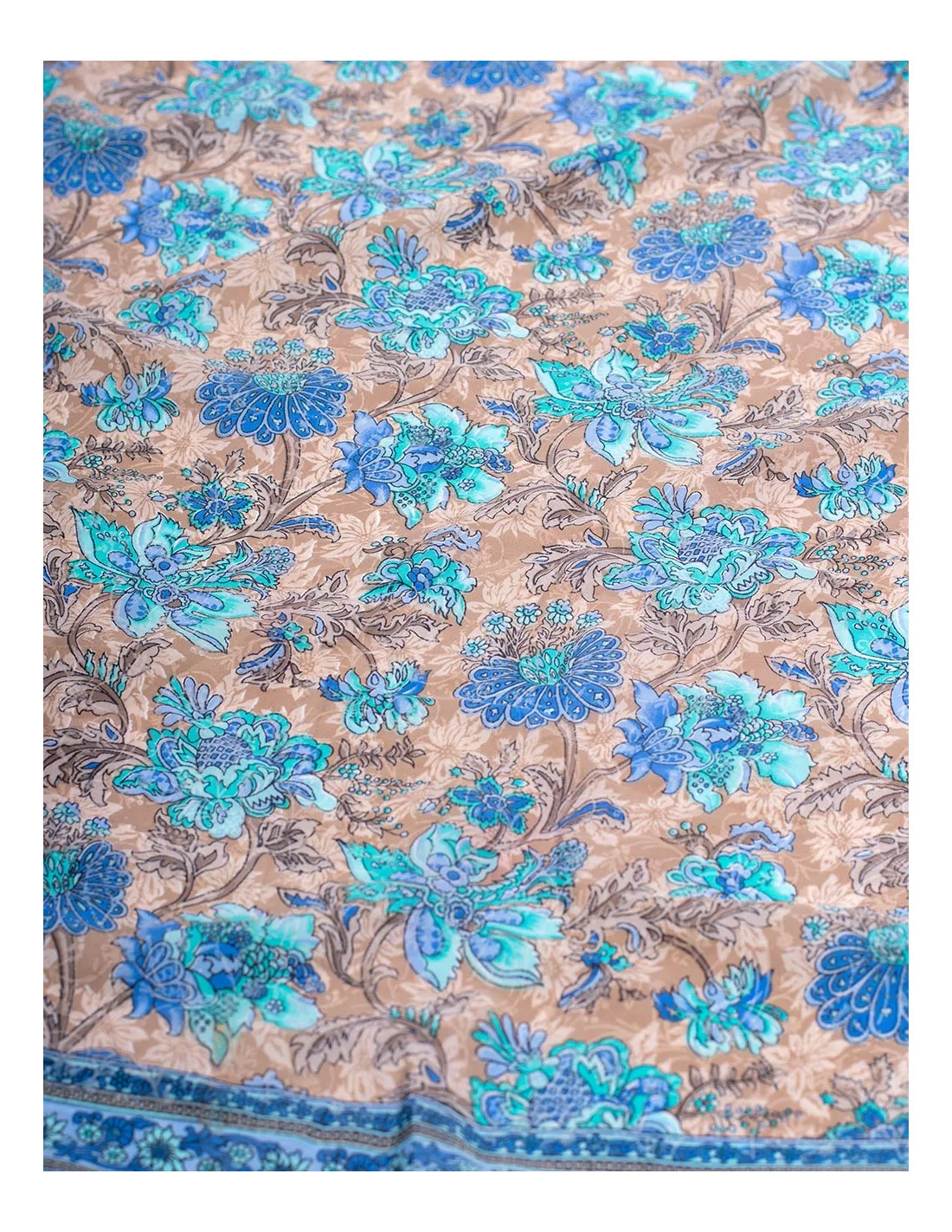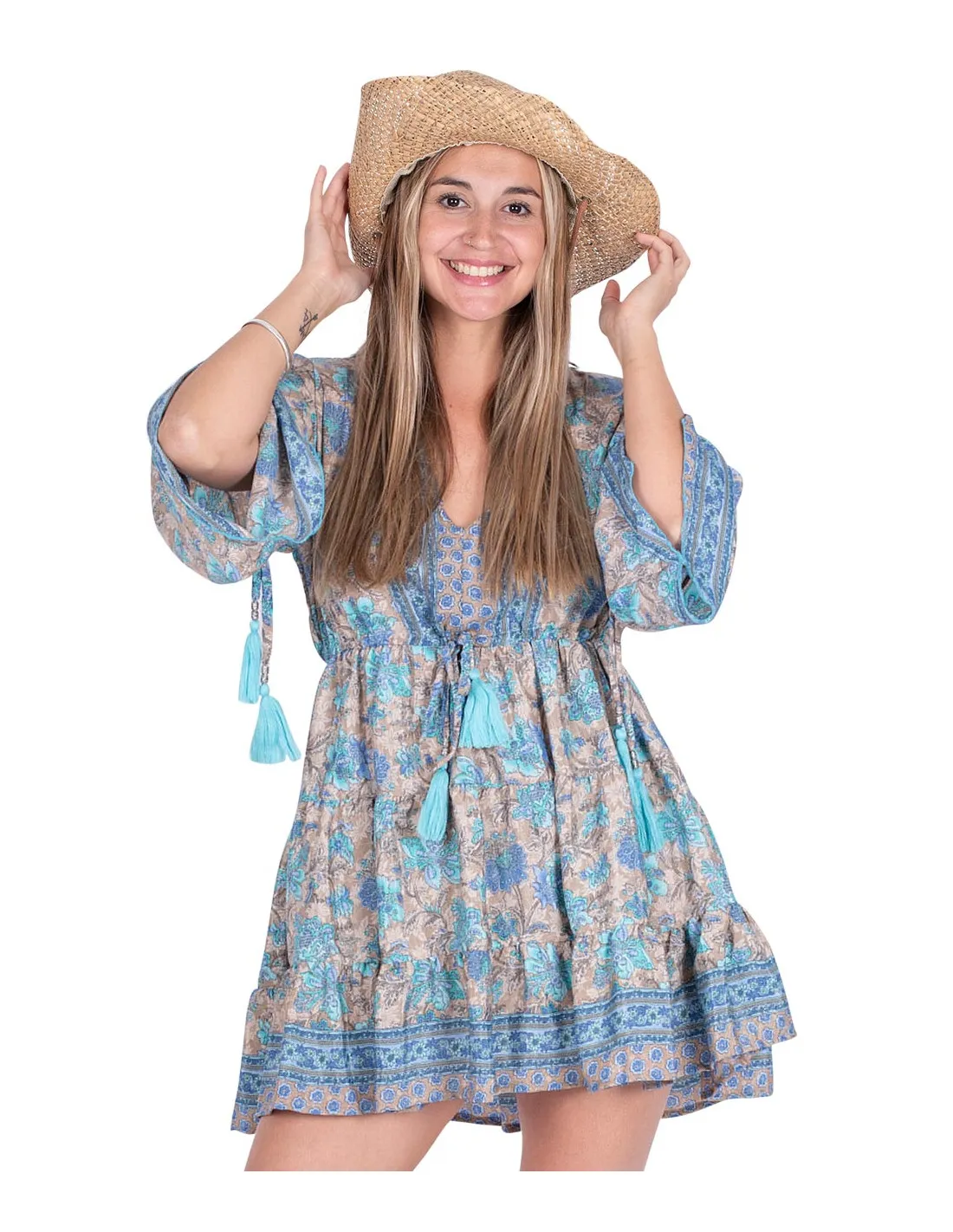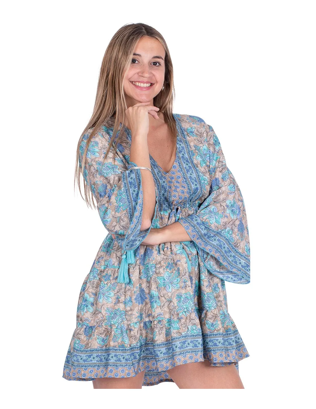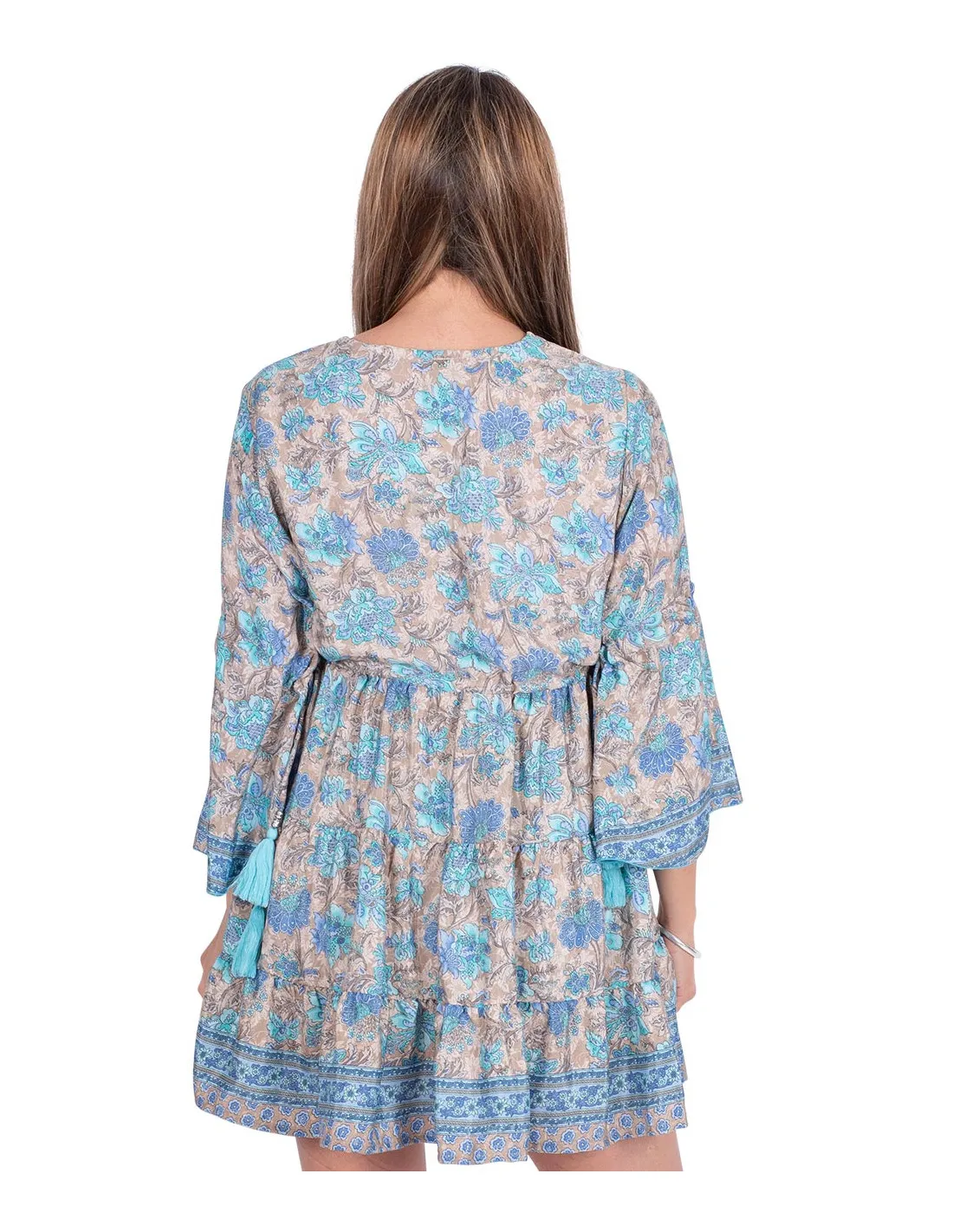 Kort kjole med rysjer og ermer i bohemsk stil. Trykket har brun bakgrunn, men et stort antall lyseblå blomster som skiller seg ut.