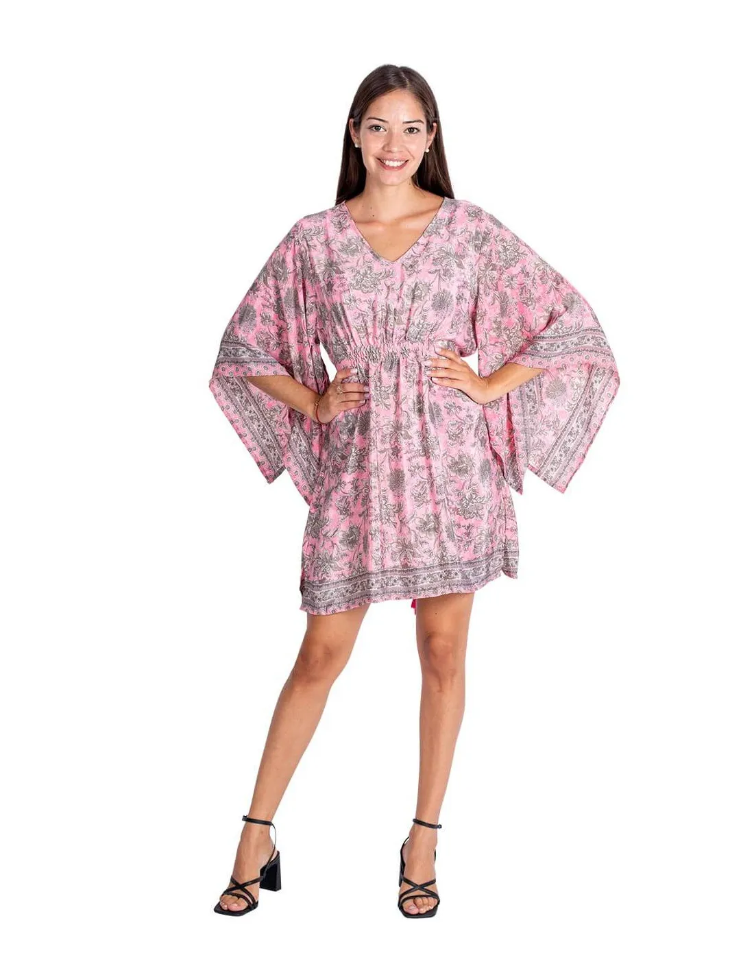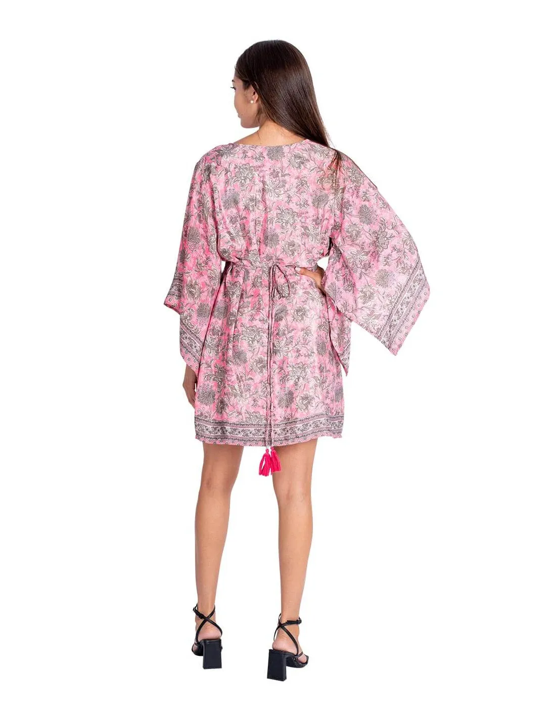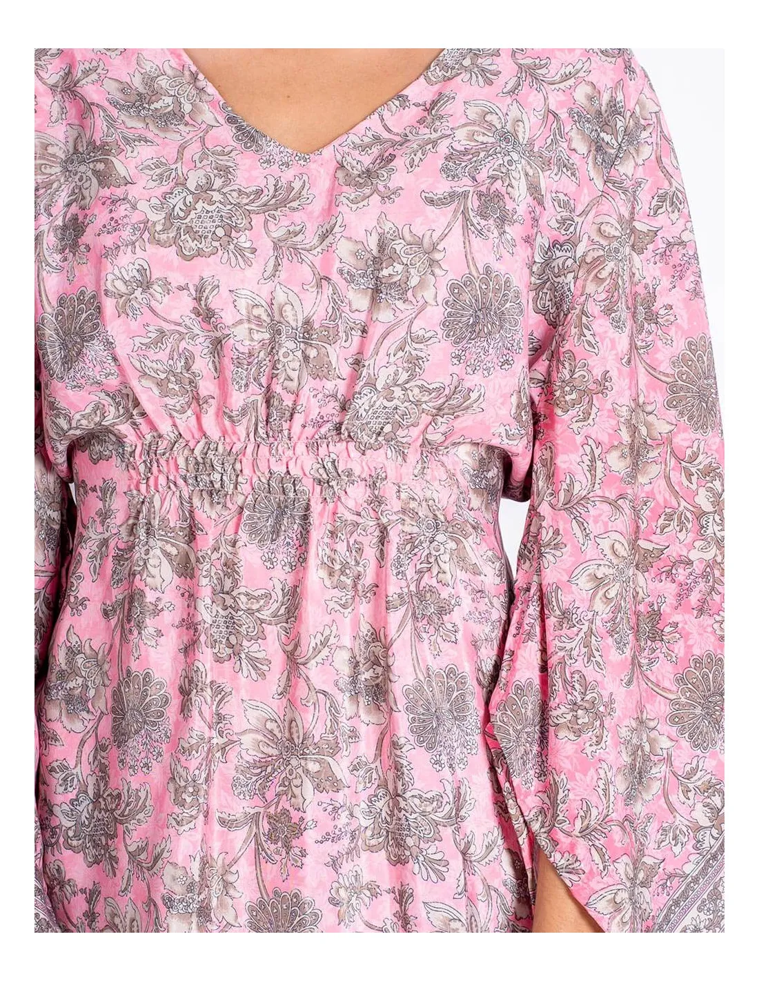 Laget av trykt silke med rosa bakgrunn og grå blomstermønster.