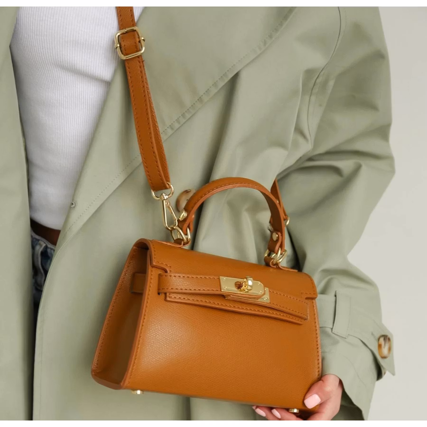 Den har gyllen maskinvare, vrilås, justerbar og avtagbar skulderrem og et innvendig rom med lommer. Den kan bæres for hånd eller crossbody.
