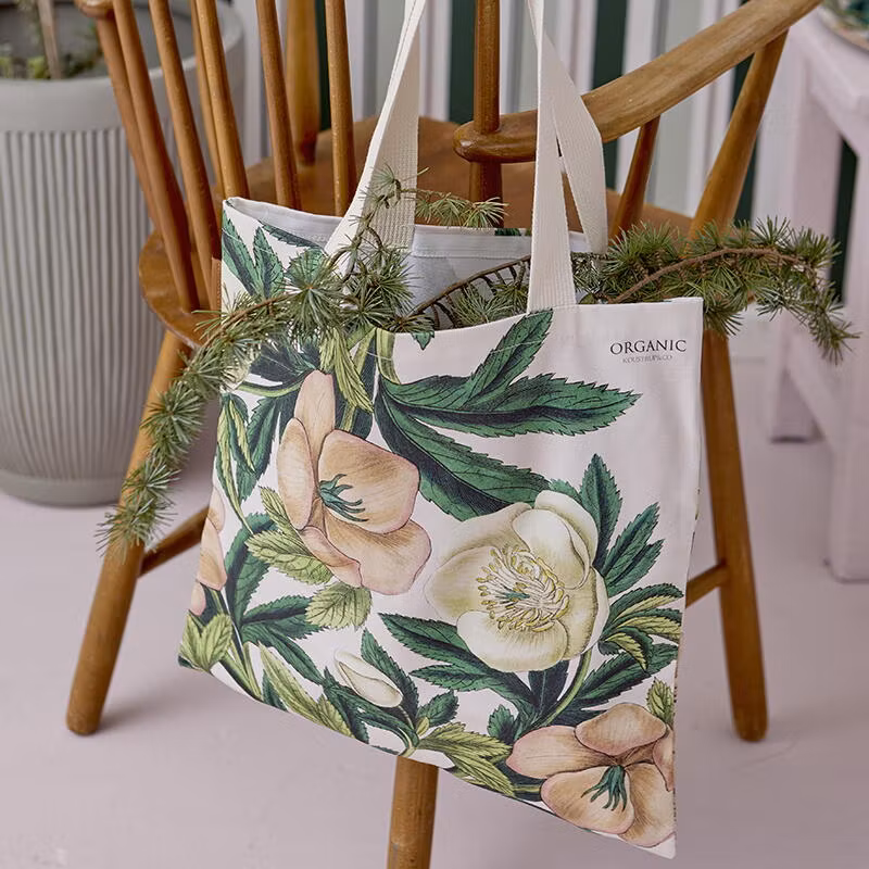 Deilig økologisk bomullsveske med helleborus (også kalt juleroser/påskeklokker). Kraftig kvalitet med gode stropper.